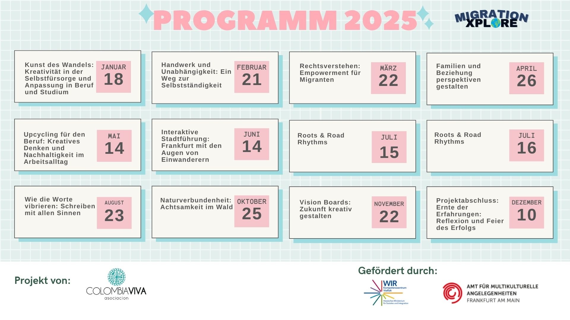 In jedem Workshop kombinieren wir kreative, sportliche und kulturelle Aktivitäten. Wir werden nicht nur über Themen im Zusammenhang mit dem Arbeits- und Studienleben in Deutschland lernen und Ihnen helfen, das Arbeits- und Studiensystem zu verstehen, sondern wir werden auch einen sicheren Raum bieten, um Leute zu treffen, neue Freunde zu finden und neue Fähigkeiten zu entdecken.