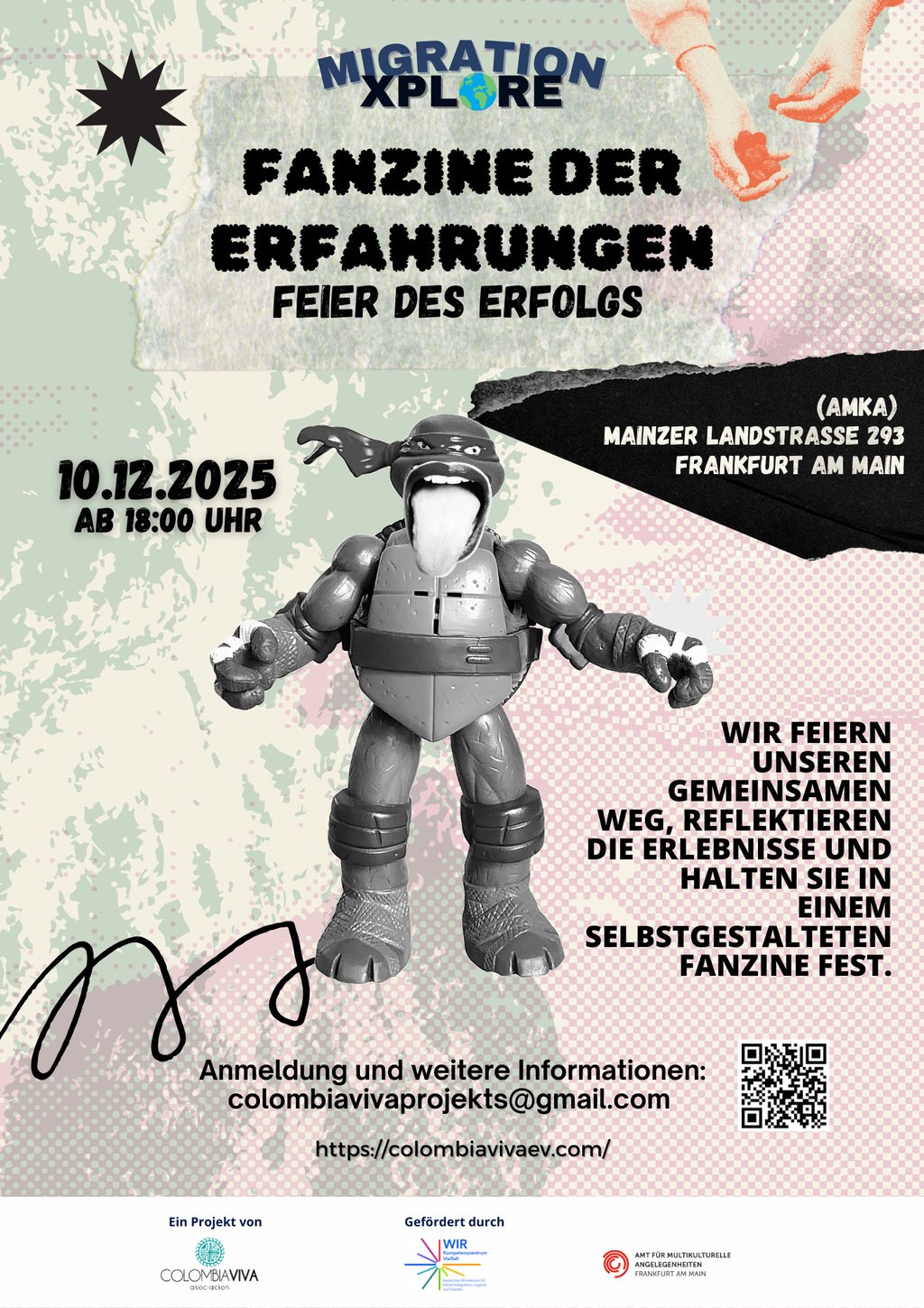 In einer Atmosphäre aus Musik, Austausch und gemeinsamer Gestaltung entwickelten die Teilnehmenden eigene Fanzines und brachten ihre Perspektiven in ein kollektives Werk ein, das Migrationserfahrungen in Bildern, Texten und Fragmenten sichtbar macht.
